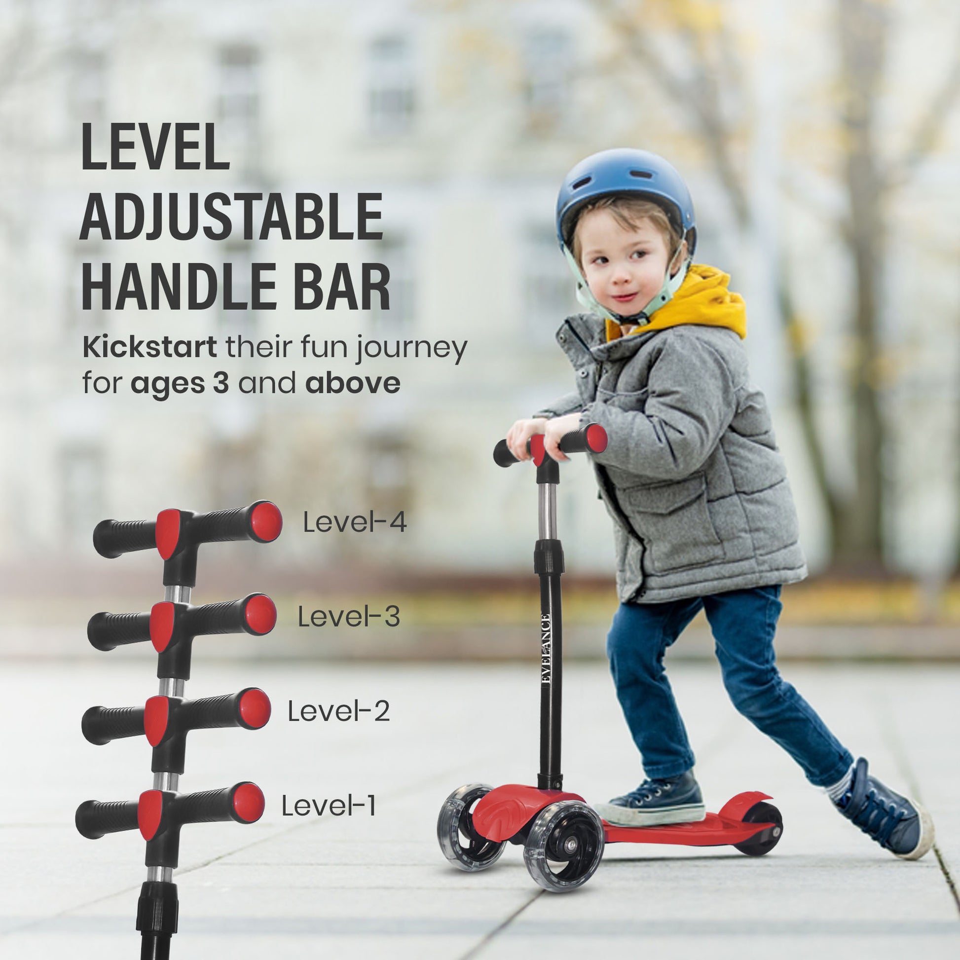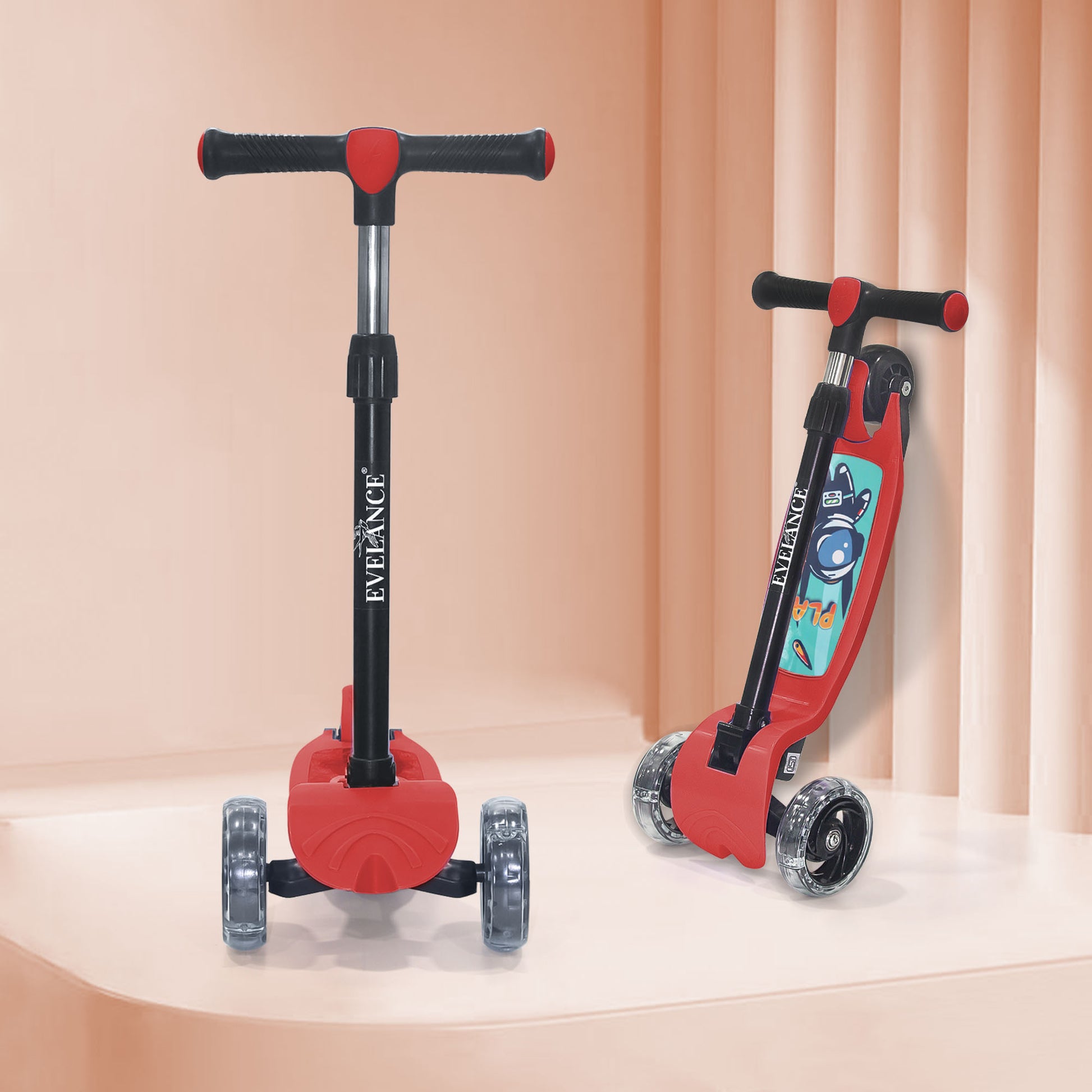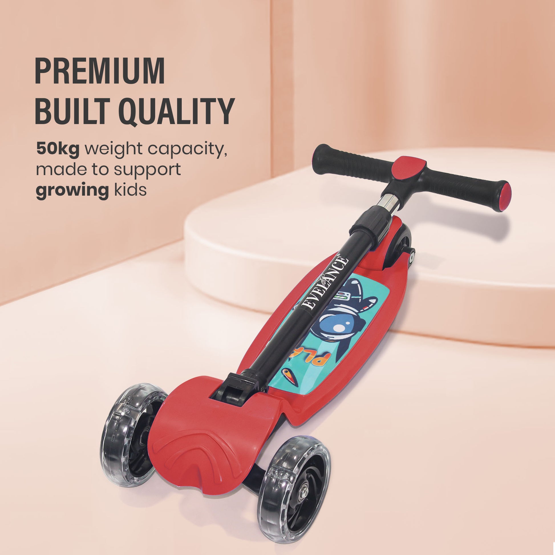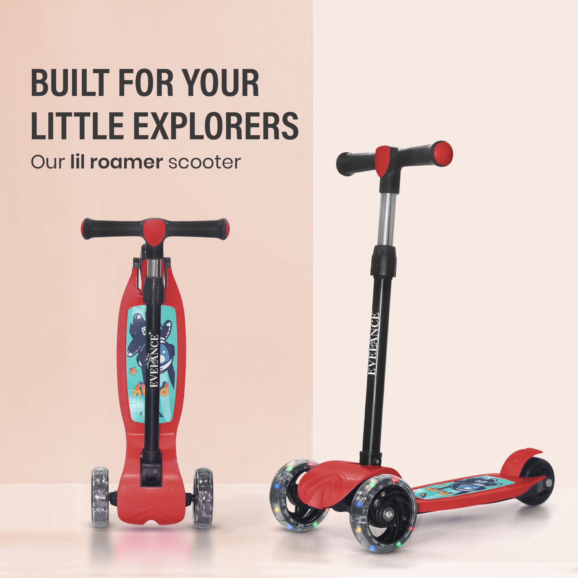 Ride into fun with EVELANCE Lil Roamer Scooter! Foldable, kick-powered, and built for kids up to 50Kg. Safe, sturdy, and super fun in Red