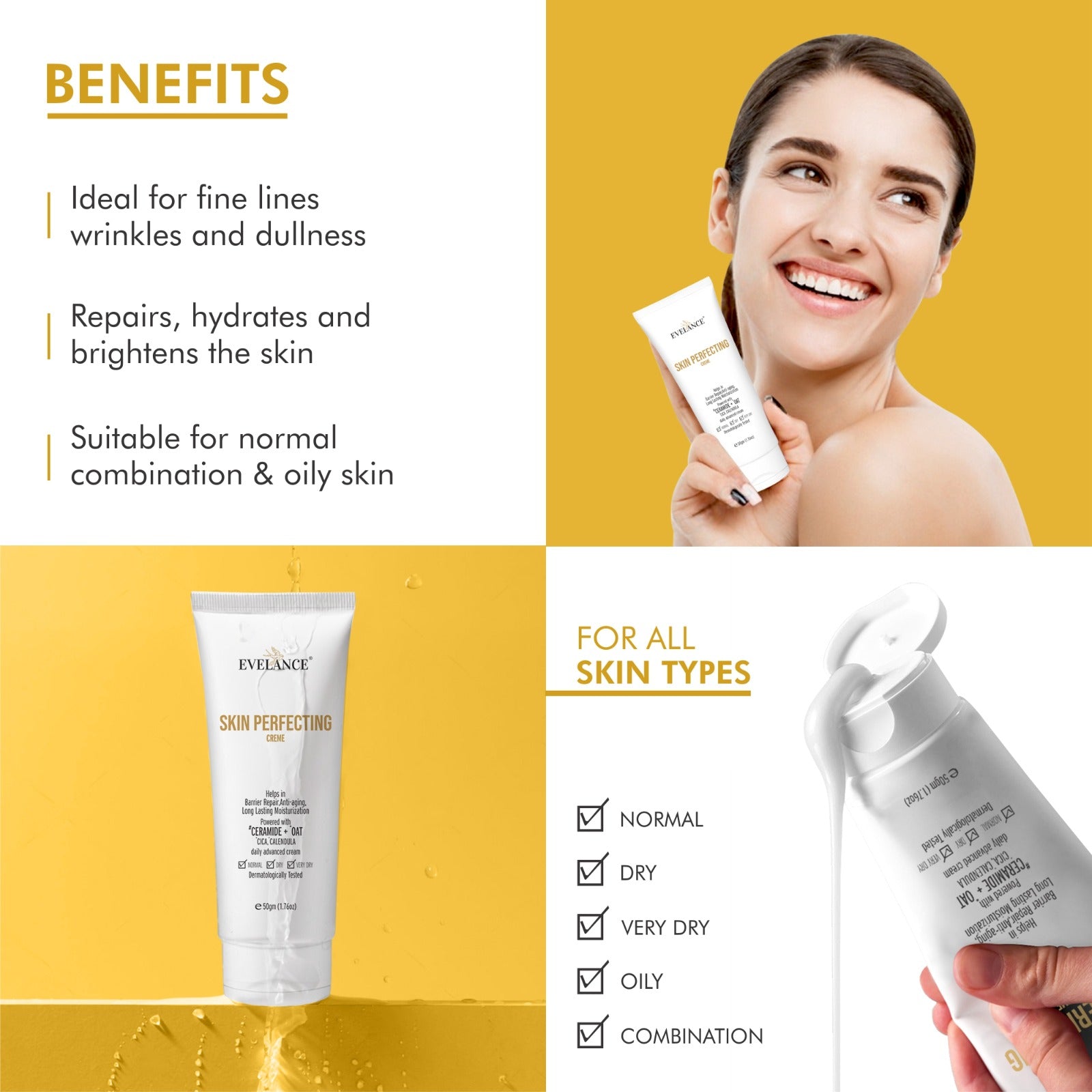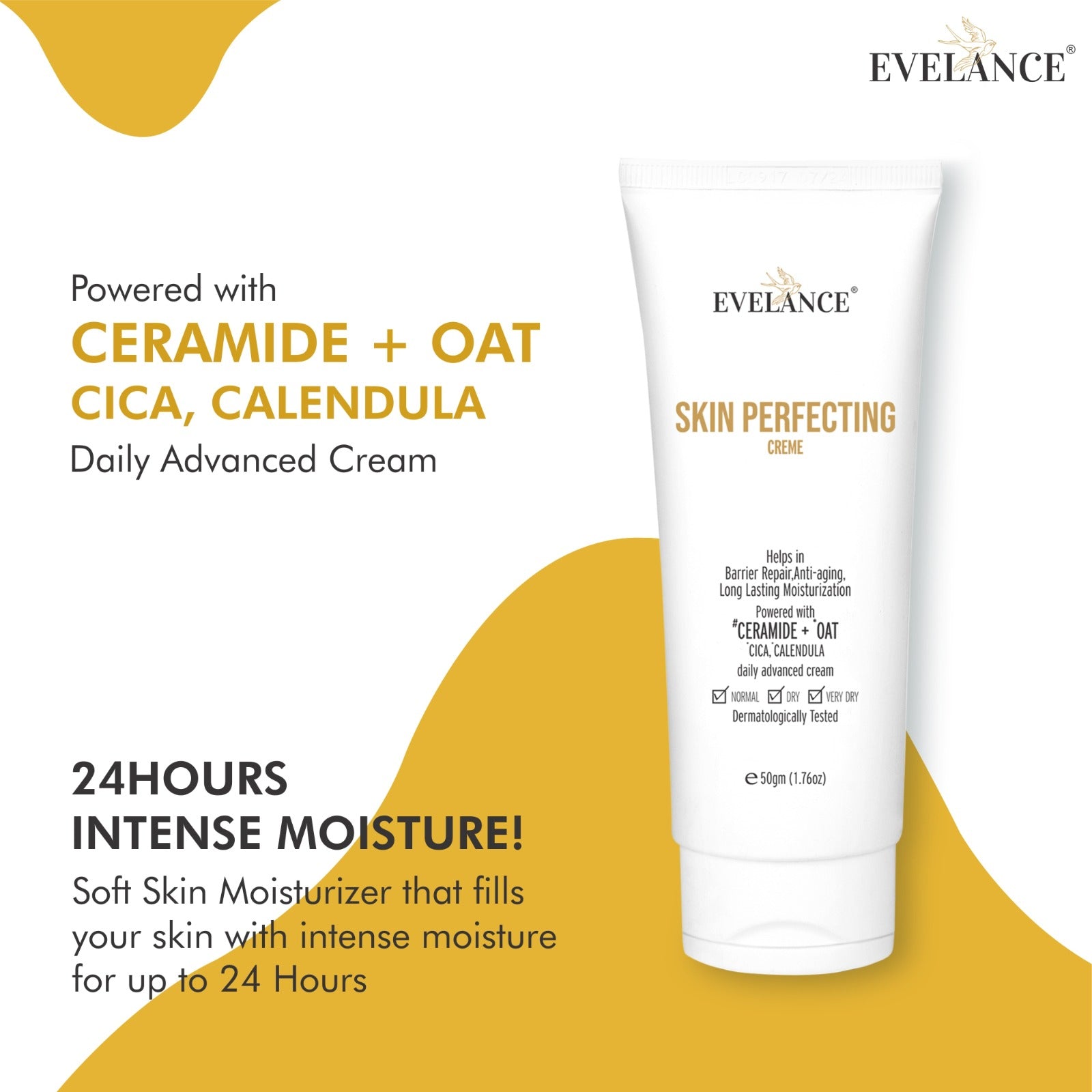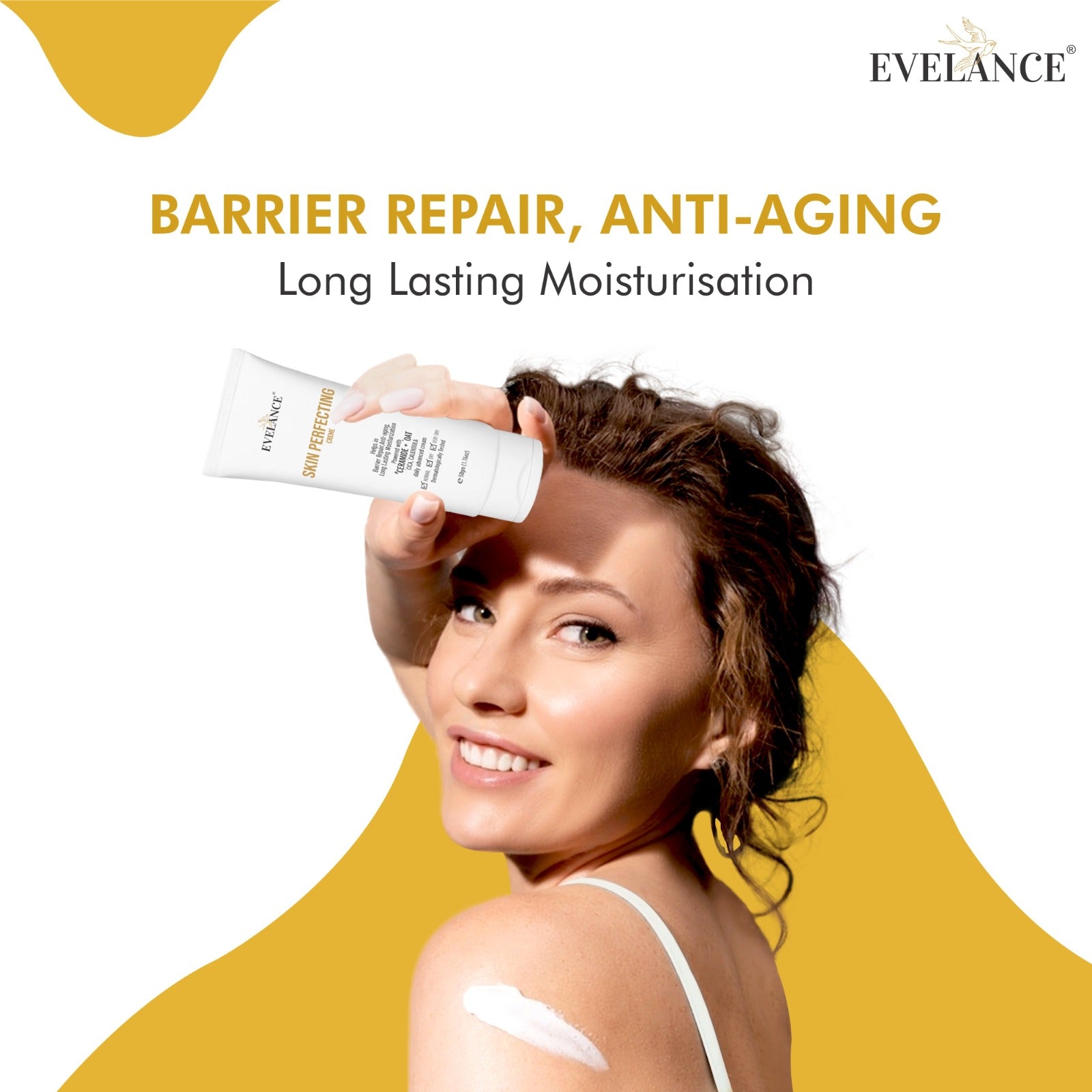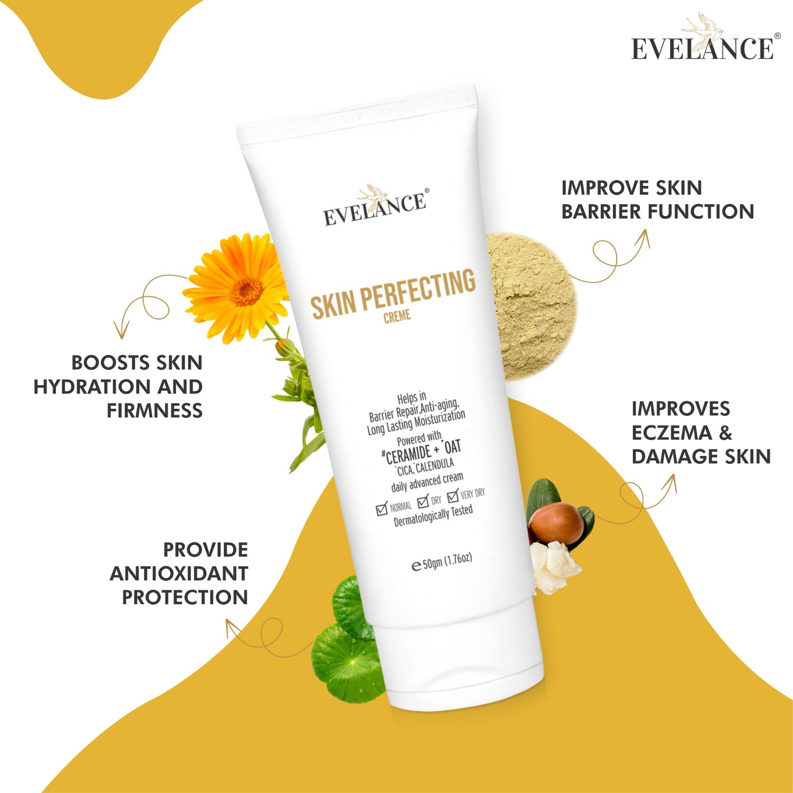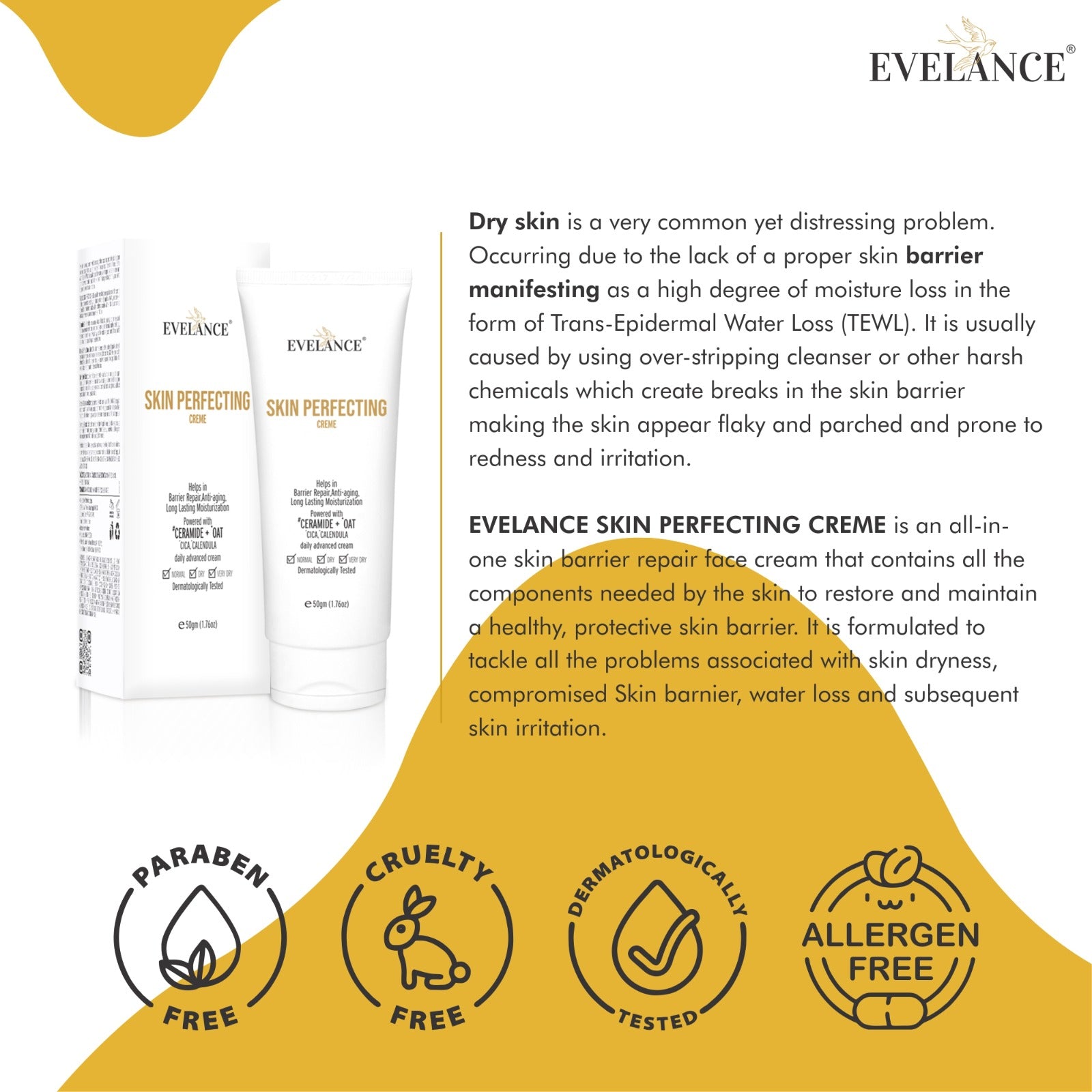Evelance Skin Perfecting Cream is a specially formulated skincare product designed to enhance and protect the skin's natural barrier. This advanced cream is aimed at providing comprehensive skincare benefits, including anti-aging properties, long-lasting moisturization, and barrier repair. It is dermatologically tested and suitable for various skin types, including normal, dry, and very dry skin.
